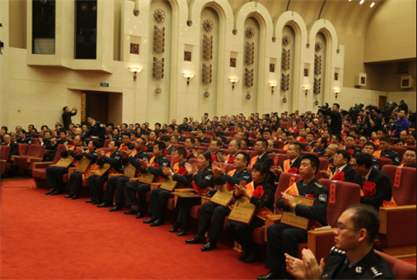 国务委员、公安部部长郭声琨出席座谈会并在表彰大会上讲话。中央政法委秘书长汪永清,全国总工会党组书记、副主席、书记处第一书记李玉赋,公安部党委副书记、常务副部长傅政华,公安部党委副书记、副部长黄明,全国总工会副主席、书记处书记阎京华,共青团中央书记处常务书记、全国青联主席贺军科,公安部党委委员、政治部主任夏崇源等出席座谈会。