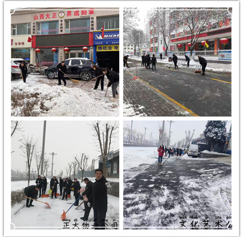 本次活动,利用1月6日—7日两天时间,我公司组织全体员工清扫了位于开发区、七一南路、逯家庄、气象北巷、通岗路等处城区驻地以及分布各县的基层驻地的院内积雪。我公司派驻各单位的保安、物业基层单位也积极行动,与服务单位的同志们一起清扫积雪,有力的保障了服务单位业务正常运行。同时,进一步延伸清扫范围,将九原东街北同蒲铁路线附近,利民西街北九巷附近,七一路小学及十一中两所学校附近等处路面的积雪进行彻底清扫,为附近群众出行提供了便利。