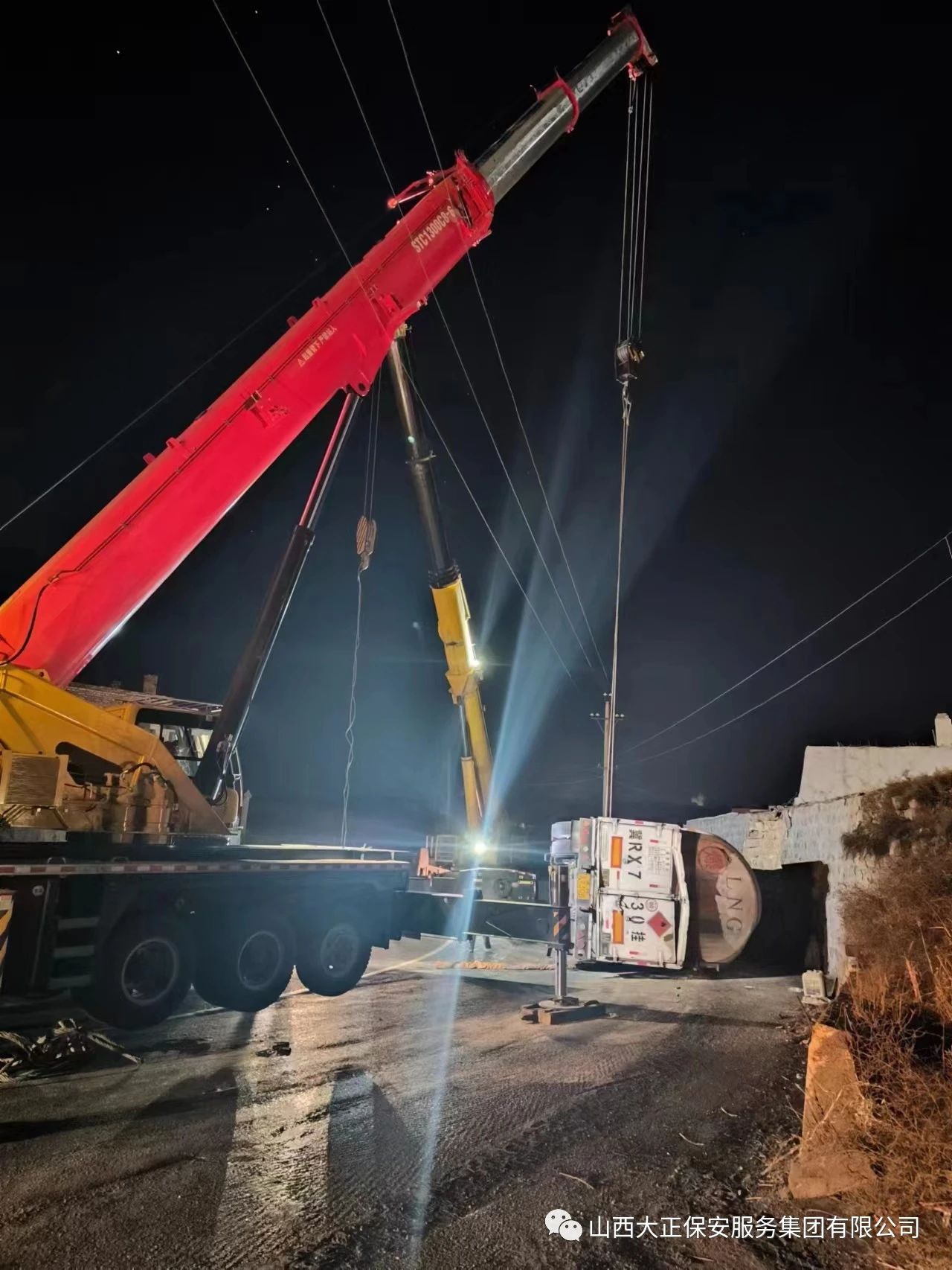 2023年11月23日晚8时,山西大正保安集团公司保德县守押中队应急救援大队接到应急局出勤指令,枣林坡有满载液化气罐车发生侧翻,需要派出应急人员控制现场,并协助处理侧翻事故。应急救援大队接到命令后,派出应急车辆两部及应急人员5人赶赴现场,协助交警对现场路段进行管控,保证周围车辆人员安全。